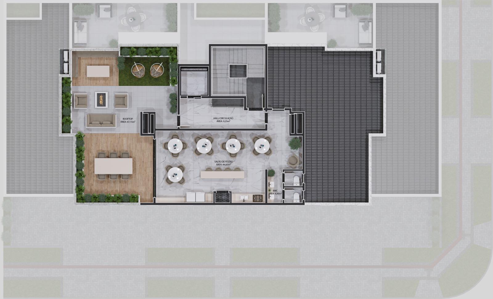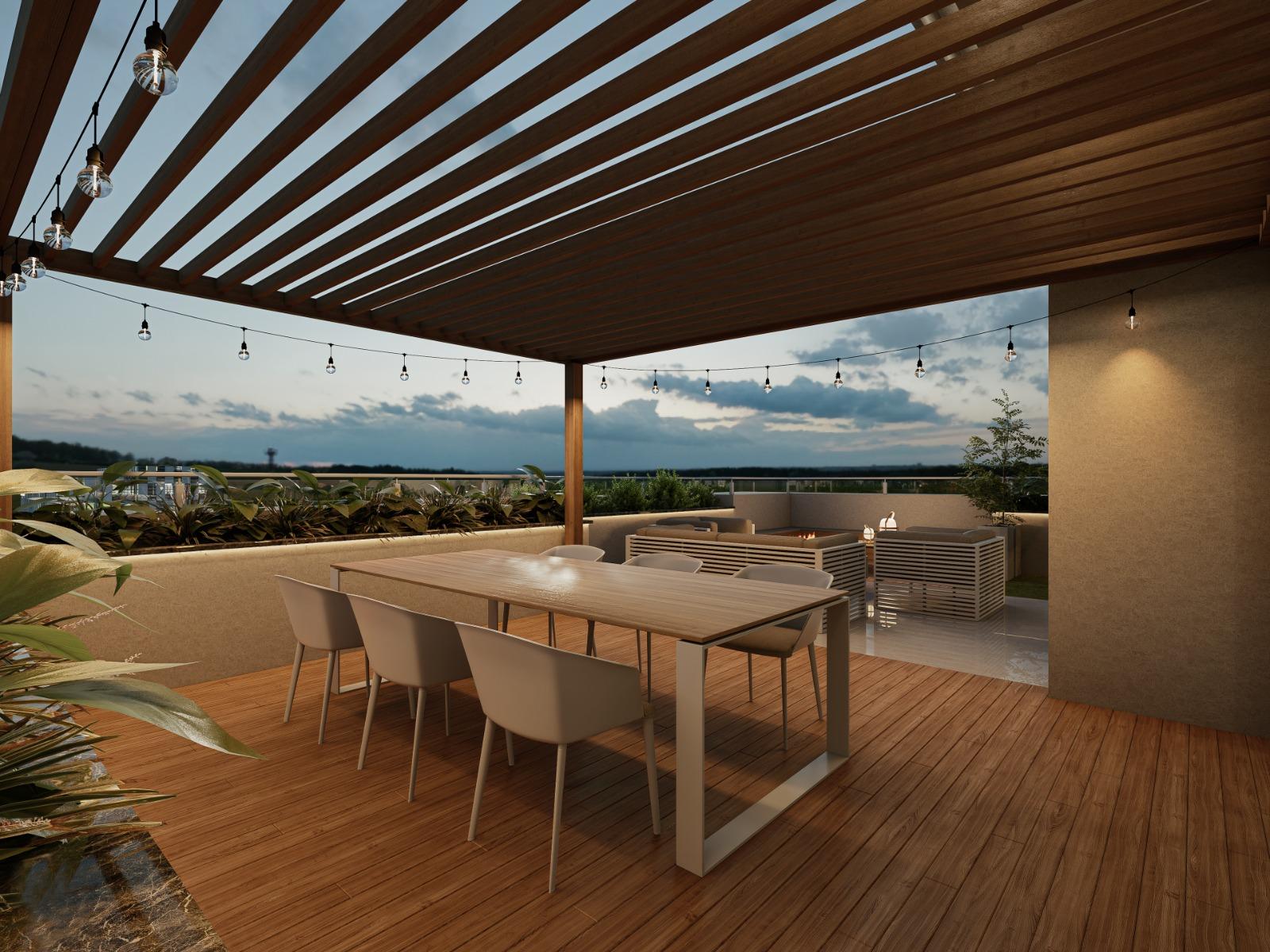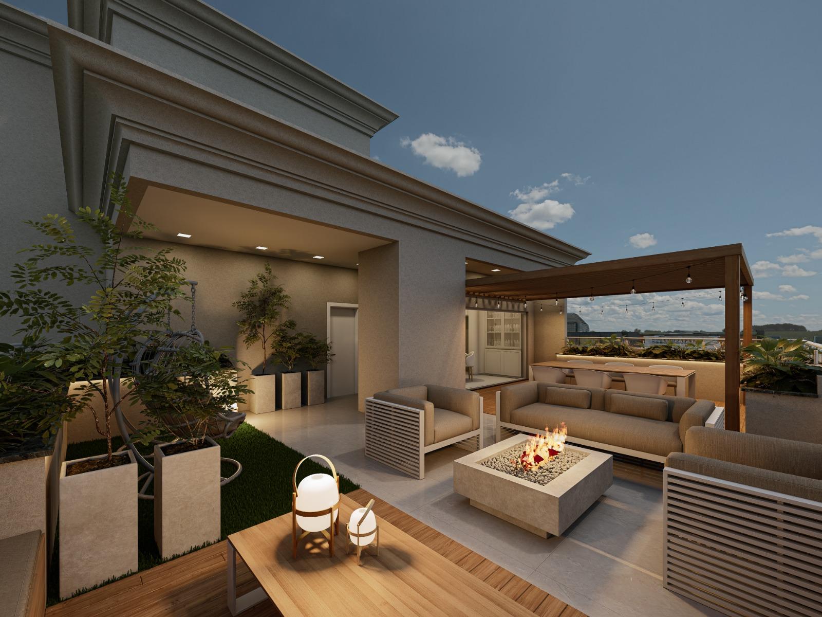- Rooftop com fireplace e lounges externos